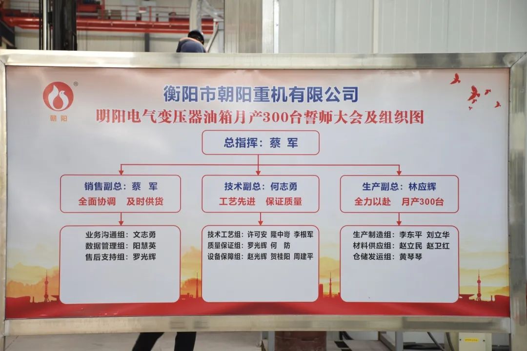 今天的宣誓在我們每個(gè)人的心中種下一個(gè)火種,將我們?nèi)w朝陽人團(tuán)結(jié)一心、齊心協(xié)力、精益求精,不斷創(chuàng)新,不斷突破,服務(wù)好客戶,提升好自身。以做好明陽電器月供300臺(tái)變壓器油箱為起點(diǎn),攻艱克難,持續(xù)追求卓越,不斷超越自我,做出一個(gè)客戶滿意、員工幸福、茁壯成長般“驕陽似火”的朝陽集團(tuán)。